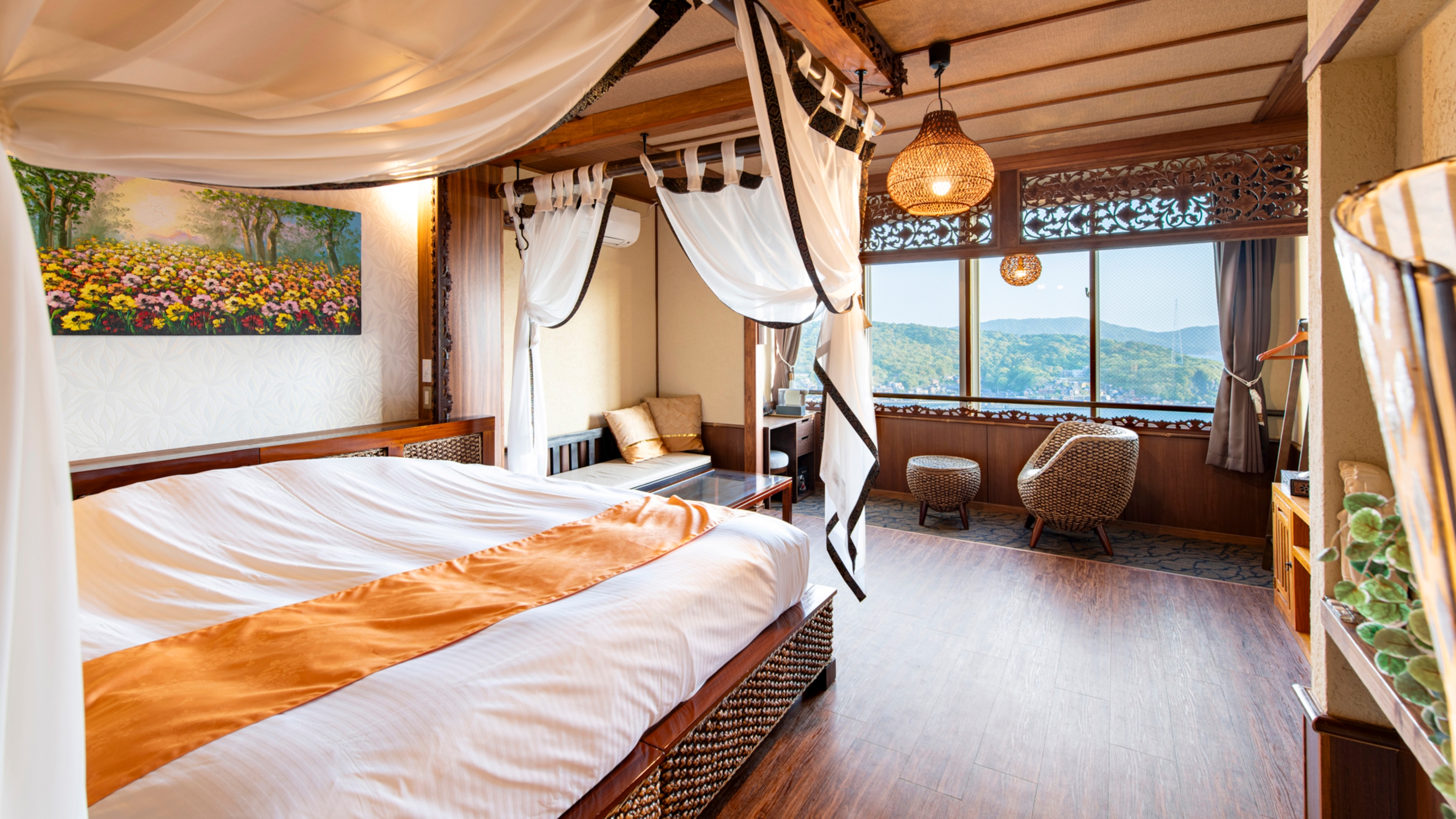 バリ風のインテリアで統一されたスイートルームでは、まるで海外リゾートに来たかのような贅沢な時間に。