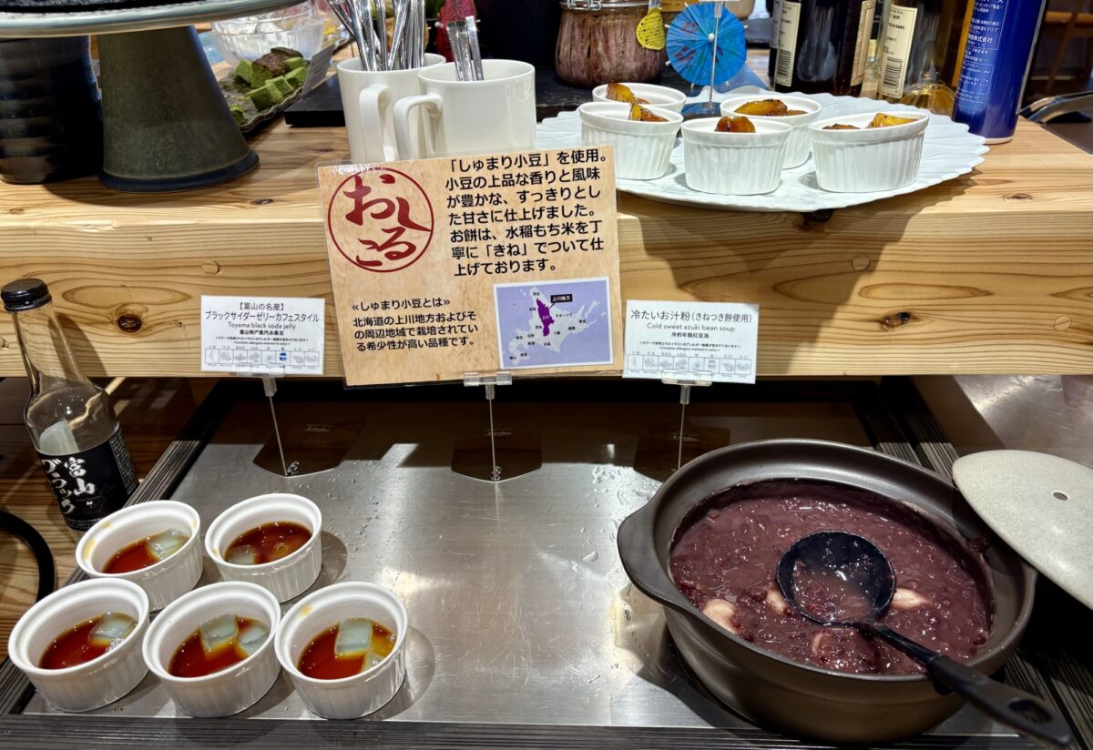 デザートは、富山ブラックサイダーゼリーやおしるこ、チュロスや抹茶ケーキなどバラエティ豊かです。