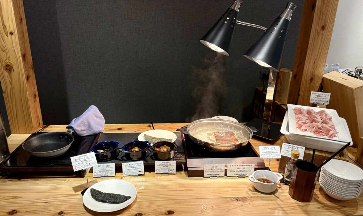 ライブキッチンでは、ブラックオムレツや富山ポークのしゃぶしゃぶをその場で提供してもらえます。